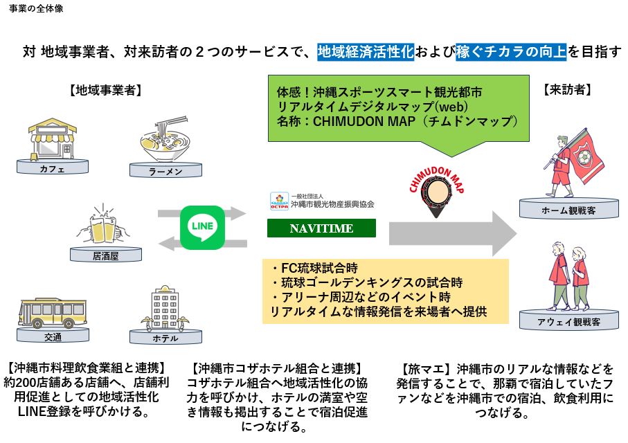 沖縄市観光物産振興協会は内閣府 令和7年度「新たな沖縄観光サービス創出支援事業」を活用し、スポーツシティである沖縄市を実証地域とし本事業をスタートします。沖縄市内で事業を営む飲食店、ホテル、観光事業者等と連携し、CHIMUDON MAP(チムドンマップ)リアルタイムで店舗情報を確認できる、デジタルマップを活用した地域経済活性化に取り組みます。